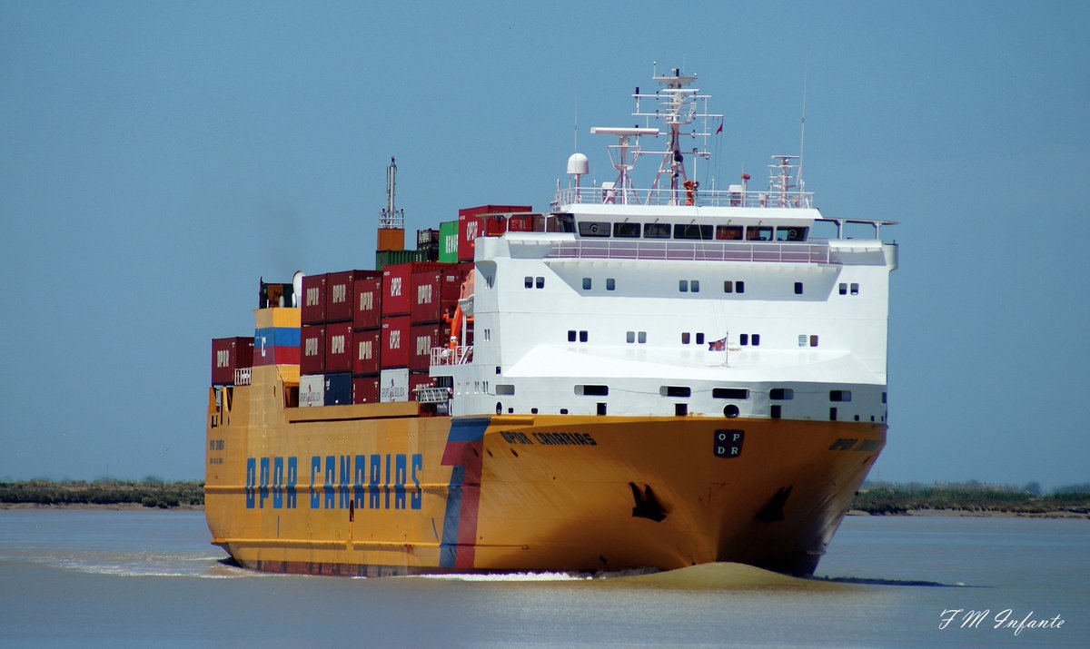 Cuando yo era más chico y más señorito, me gustaban los barcos, como los trenes, de pasajeros. Ahora, que me río del turismo y de los cruceros, los que más me gustan son los barcos de mercancías, cuanto más grises y feos y faltos de pintura, mejor que mejor. No es el caso del OPDR CANARIAS, camionero elegantón entre las Afortunadas y Sevilla, puerto de.