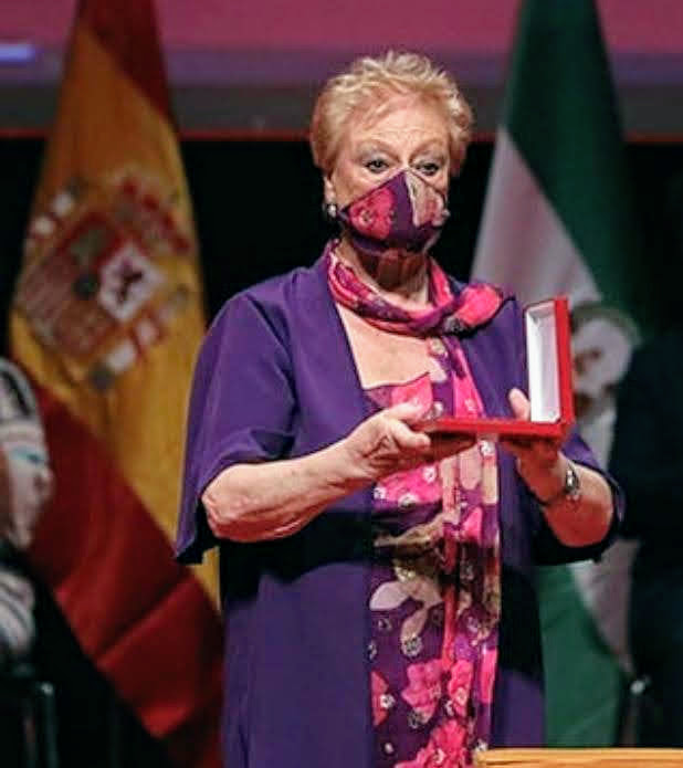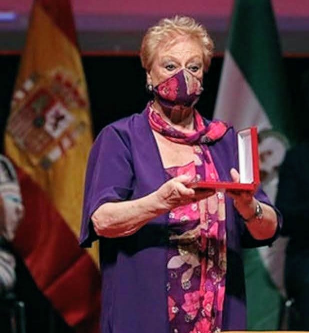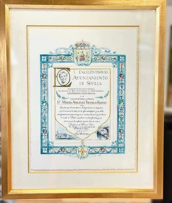 MEDALLA, INSIGNIA Y DIPLOMA. Como se deja leer en el diploma (como libro de reglas), Doña María Ángeles Yruela Rojas recibe, por igual, trato de “Excelentísima Señora” como Excelentísimo es el Ayuntamiento de Sevilla.