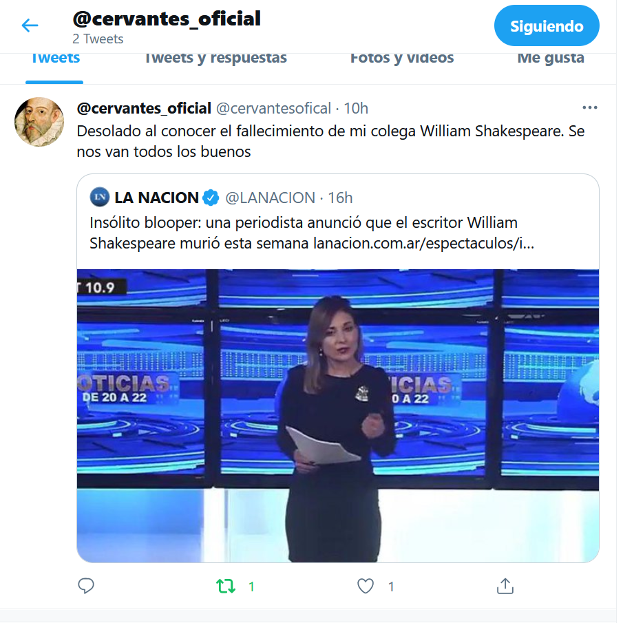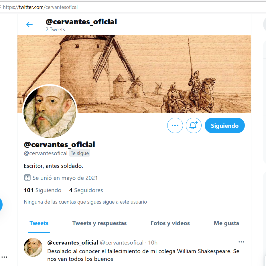Otis B. Drifwood es el personaje de Groucho Marx en Una noche en la ópera, película de San Wood, en 1935. Otis B. Drifwood es también el alias o el avatar de DrHackenbush, arrobita valenciano nacido en el amanecer de los 80, amante del humor y de la libertad de las personas. Impostor como él, Cervantes Oficial (https://twitter.com/cervantesofical, literalmente ofical), quien, como ustedes ven en captura de pantalla, se inaugura en redes en este mayo loco que llevamos, para manifestarse “Desolado al conocer el fallecimiento de mi colega William Shakespeare. Se nos van todos los buenos”, respuesta a un “Insólito blooper: una periodista anunció que el escritor William Shakespeare murió esta semana” publicado en La Nación, Argentina, unas horas antes con motivo de este fallo o metedura de pata (que eso es un blooper): La conductora de Canal 26 se equivocó al comunicar el fallecimiento del primer hombre vacunado contra el coronavirus, del mismo apellido que el dramaturgo. 28/05/21. (Pueden leerlo pinchando aquí).