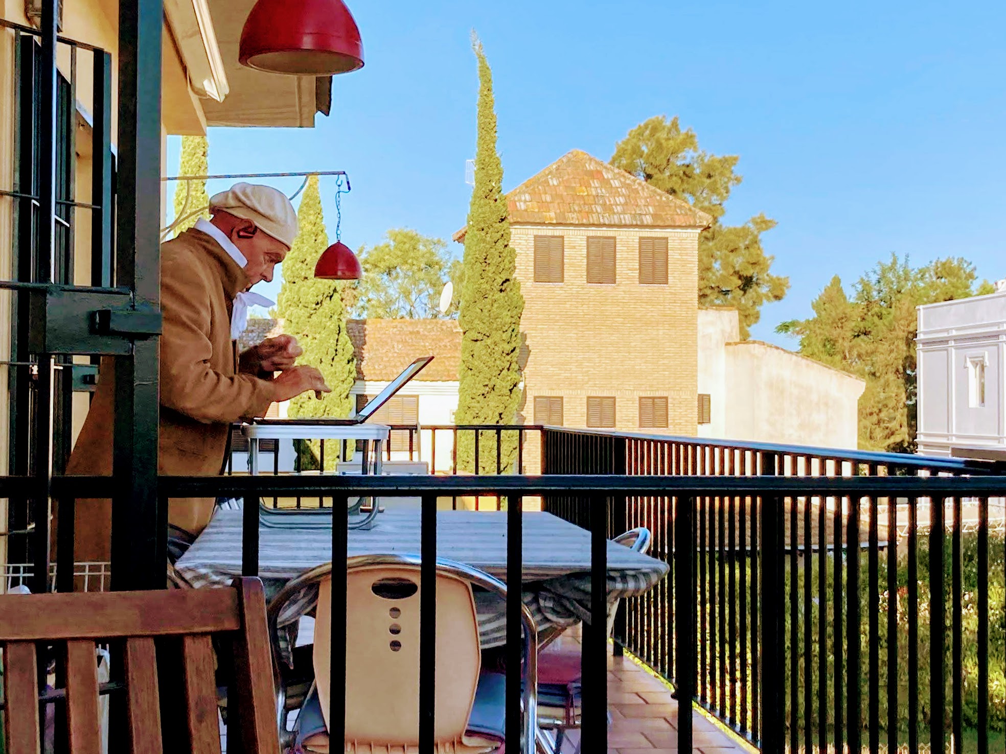 Vengo de tirar la basura (limpia reciclable, única que a esta hora de la mañana se deja echar). La lógica de los contenedores me habla de las prioridades de mi barrio. Lo que menos hay es de cartón y papel, y eso que dicen Tu papel es importante. Tras esta burda observación, lo que me hace pensar es mi traje, este que pueden ver por fotos tomadas por mi vecino. El hábito talar que llevo (talar es túnica o falda que llega hasta los talones) me sirve para andar por casa y de casa a recados de cercanías, como al contenedor de papel, a unos quinientos metros de la terraza donde se me ve al teclado.