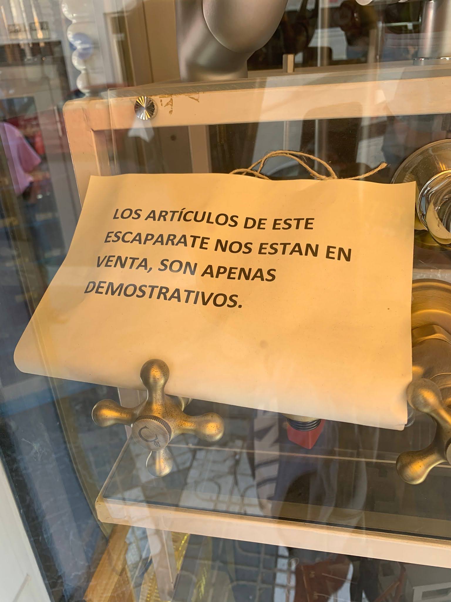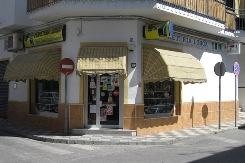 Esta de Lorca nos llama la atención no exactamente porque se llame Lorca -es la calle de la ferretería- sino por el cartel que avisa a la clientela sospechosa: «Los artículos de este escaparate nos estan en venta, son apenas demostrativos».