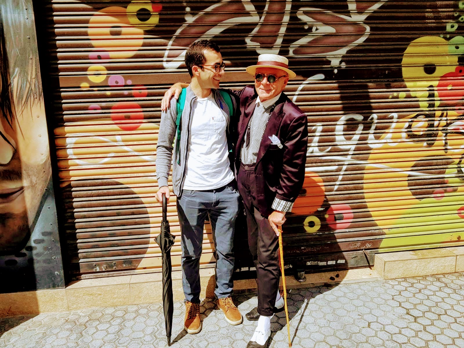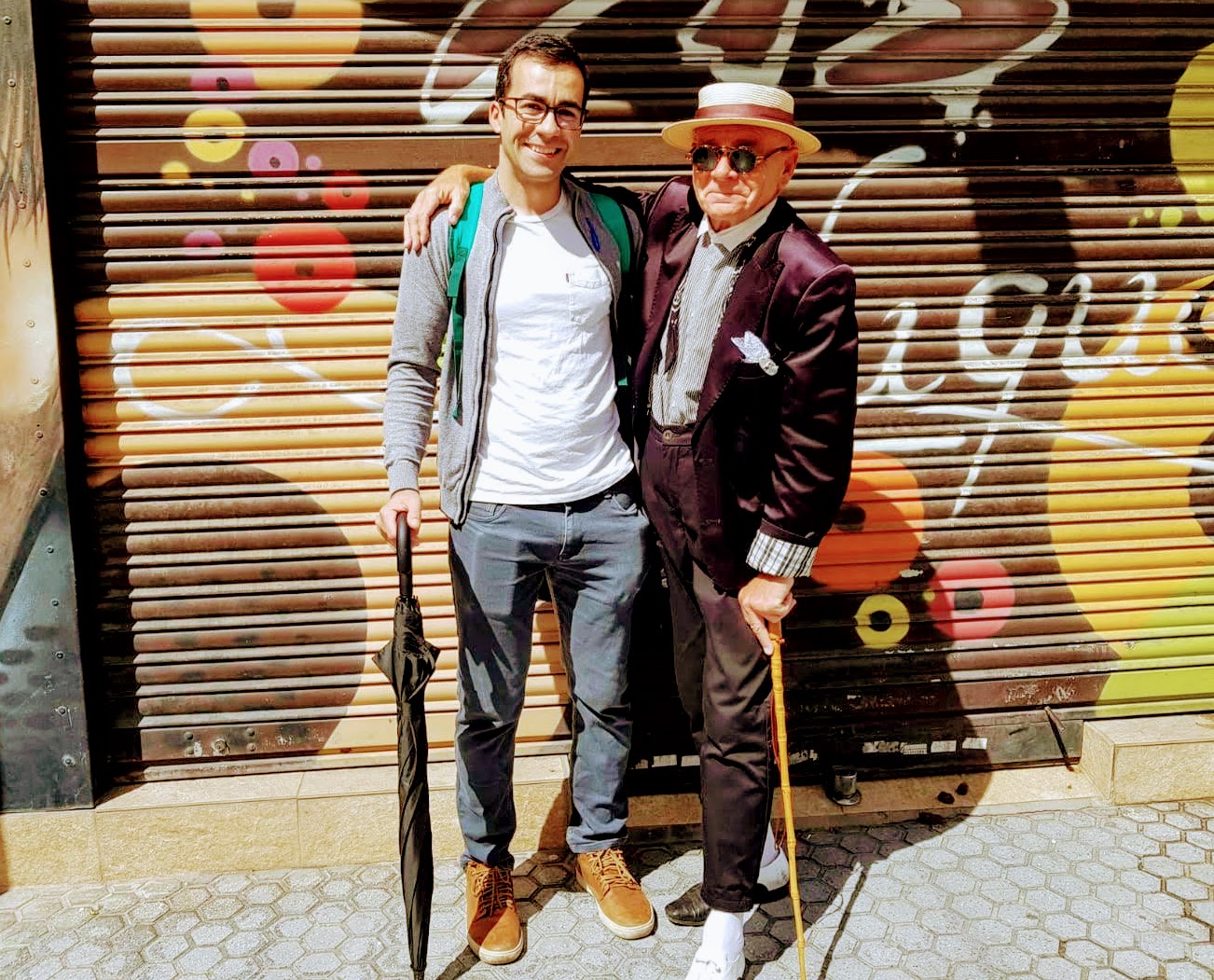 Las fotos llevan fecha 22 de abril 2019, día que fue lunes y víspera del Libro. Antonio Orta, con paraguas, indica que fue día de paraguas. Daniel Lebrato, con su bastón de caña, demuestra otra cabeza en otra parte. La foto la hizo la chica y fue contra algún grafito cierre por la calle Feria de Sevilla. No había empezado aún la pandemia.
