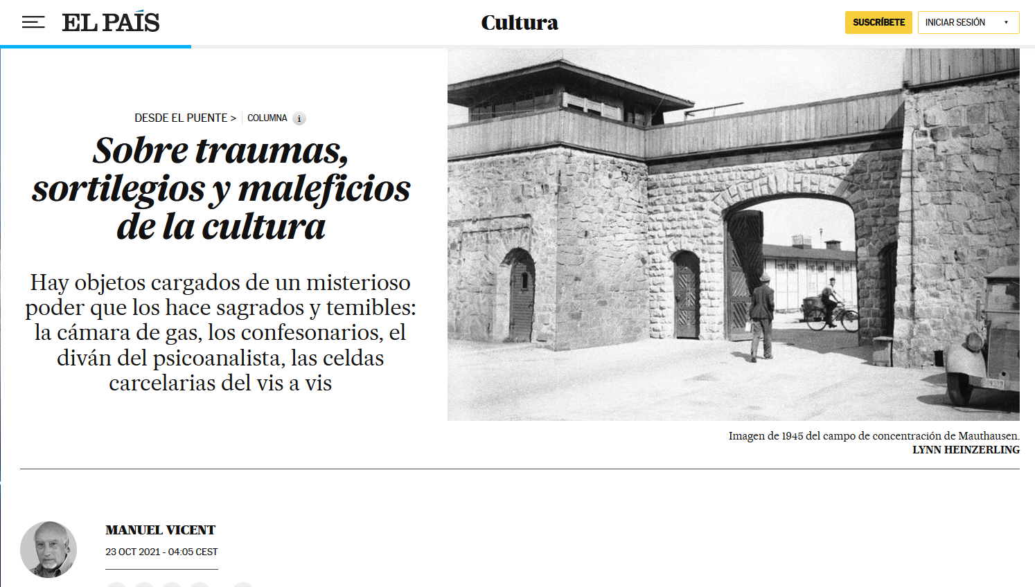 Luego resulta que no. Y el subtítulo de Manuel Vicent nos baja enseguida de la nube: «Hay objetos cargados de un misterioso poder que los hace sagrados y temibles: la cámara de gas, los confesonarios, el diván del psicoanalista, las celdas carcelarias del vis a vis». O sea. No es cultura el tándem que forman la culpa y la pena, con todo el aparato represivo que traen consigo jueces, guardias, verdugos y carceleros de los tres poderes (el del Gran Poder sería el cuarto), ni, cultura, el malestar de la cultura que conduce al psicoanálisis.