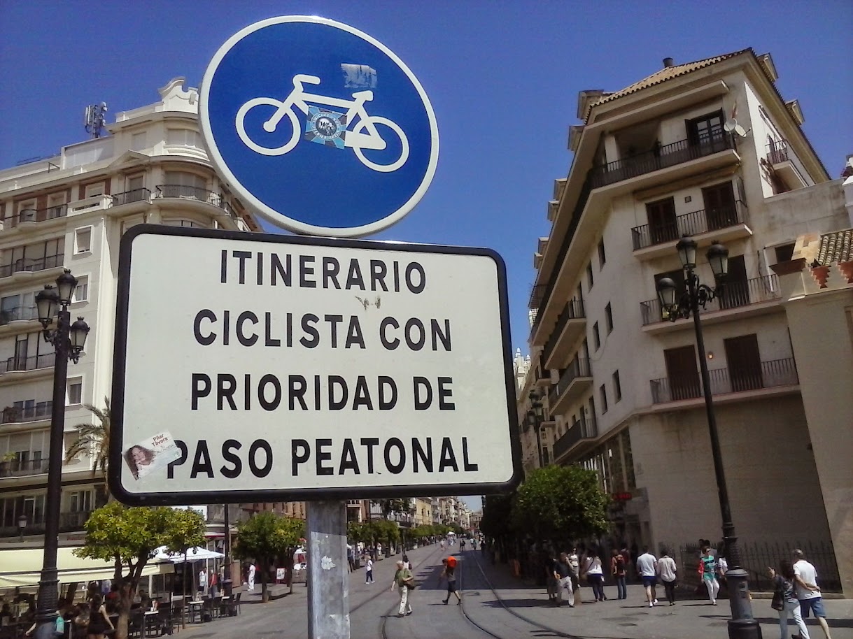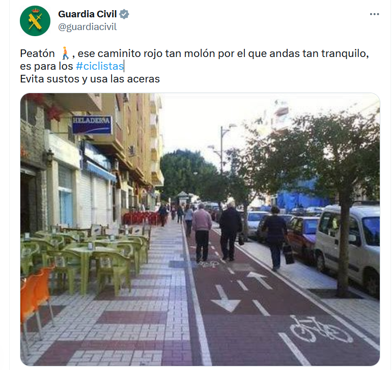 La Guardia Civil no entiende de bandos ni ordenanzas municipales y la DGT piensa solo en relaciones entre vehículos. La coexistencia ciclistas y peatones es cosa de ciudades como Sevilla en Bici que se han inventado aceras-bici donde se pedía y se esperaba carriles-bicis. A partir de ahí, corresponde a ciclistas cuidar de peatones y decir al ayuntamiento: «¿Acera-bici? No, gracias». En definitiva, «Ciclistas por la calzada».