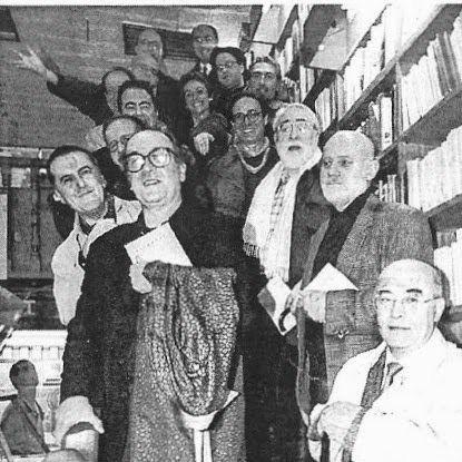 Pie de foto a La escalera de Padilla. Arriba en el centro, Pilar Villalobos (mano abierta derecha extendida). De abajo arriba, subiendo escalones por la baranda de Buly: Buly, JCW, JJT, EHS, JJDT, DL (mano izquierda tendida), JMD. Sobre Moreno Jurado (JAMJ): JAMJ, JGM, PC, JJEV, EC, MF, CGA. Fuera de escalera a la izquierda, Pepe Lebrato, co-impresor. Foto: Juan Carlos Vázquez (08/03/2001).