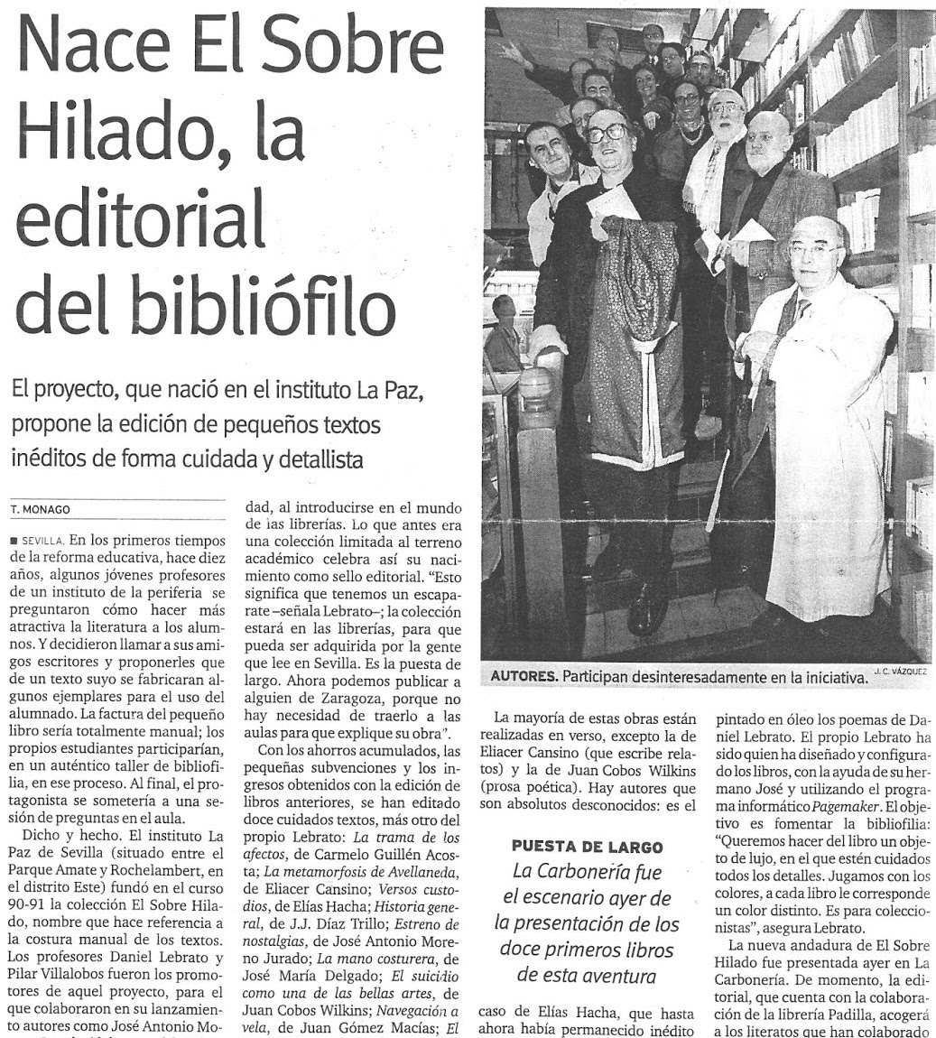 Nace El Sobre Hilado, la editorial del bibliófilo. El proyecto, que nació en el instituto La Paz, propone la edición de pequeños textos inéditos de forma cuidada y detallista. Doce por doce (12×12), doce libritos presentados a la prensa en la escalera de Librería Padilla y, al público, en La Carbonería de Sevilla: Carmelo Guillen Acosta, Eliacer Cansino, Elías Hacha, J.J. Díaz Trillo, José Antonio Moreno Jurado, José María Delgado, Juan Cobos Wilkins, Juan Gómez Macías, Juan José Espinosa Vargas, Juan José Téllez, Miguel Florián y Pedro A. Cantero por Antao da Rocha. Fuera de cuentas y con el número 13, Daniel Lebrato ilustraba en décimas las Alimañas de Buly.