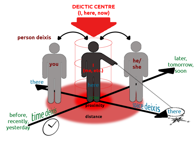 Son deícticas todas las expresiones lingüísticas (del tipo yo, aquí, ahora) que se interpretan en relación con un elemento de la enunciación (interlocutores, coordenadas de espacio y tiempo).