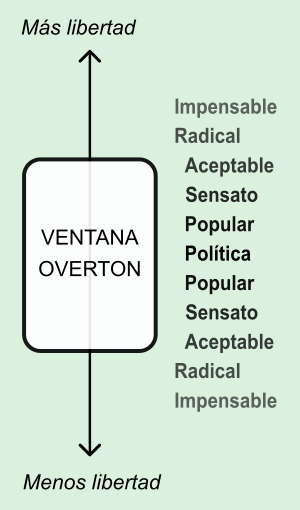 Una idea se define por contraste o comparación tanto o más que por opciones políticas. En teoría de la comunicación política, la ventana de Overton representa una escala de más libertad de expresión a menos libertad real, pasando desde lo impensable a lo legislado, por grados: 1lo impensable, 2lo radical, 3lo aceptable, 4lo sensato, 5lo popular, 6ley. La ventana de Overton está pensada para que la sociedad acepte un cambio sin darse cuenta. Es lo que pasa con la ley Trans.