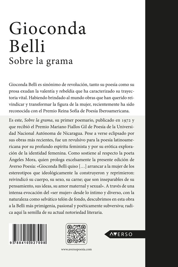 En 1972, Gioconda Belli publicaba su primer poemario, Sobre la grama, y rompía de un modo definitivo con la tradición poética latinoamericana. El profundo espíritu feminista de este libro, así como su erótica exploración de la identidad femenina, revolucionaron las letras del universo hispanohablante. Como asegura Ángeles Mora en el prólogo: Gioconda Belli quiso arrancar a la mujer de los estereotipos que ideológicamente la construyeron y reprimieron: reivindicó su cuerpo, su sexo, su carne; que son inseparables de su pensamiento, sus ideas, su amor maternal y sexual. No consta que Gioconda Belli haya leído ni a Marx ni El capital.