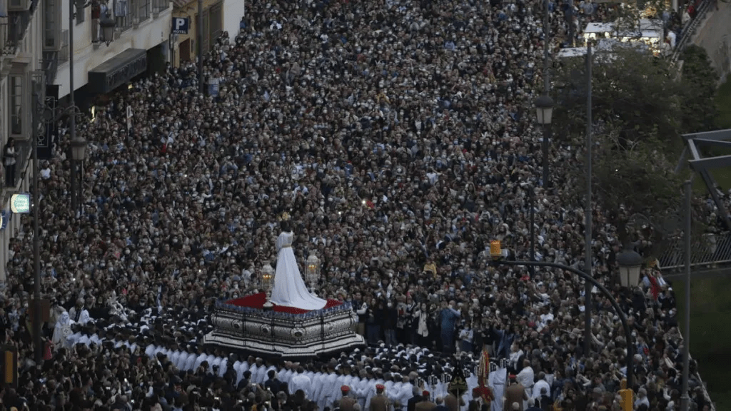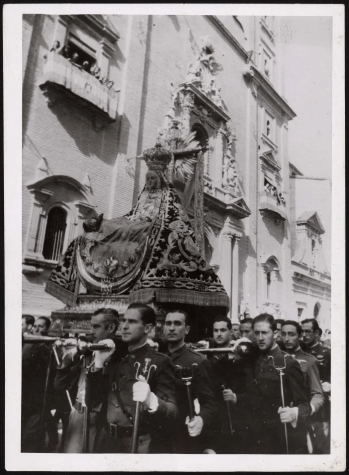 Alféreces provisionales portan a la Virgen de las Angustias, Granada, 22 09 1940. La imagen lleva un manto bordado con 535 estrellas en recuerdo de los soldados granadinos caídos durante la guerra civil. La purificación católica, la simbolización nacionalista y la militarización de los rituales pervivió durante toda la dictadura y fosilizó una serie de prácticas e imaginarios aún hoy vigentes, integrados como prácticas ancestrales. Podemos detectar matices y discontinuidades, sobre todo desde la creación en 1951 del Ministerio de Información y Turismo, con campañas de desarrollo económico con la atracción de visitantes. Para generar experiencias atractivas, el Ministerio incentivó la auto exotización en clave folclórica y costumbrista, dentro del regionalismo bien entendido y de los referentes de la españolada y la pandereta. En esta línea, los tópicos andaluces (flamenco, playas, toros, espectáculos religiosos, ferias y romerías) se convirtieron en imagotipos, como ironizaba Berlanga en Bienvenido Mr. Marshall, estrenada en 1953. En 1963, se creó el título de Fiesta de Interés Turístico. El Ministerio convocaba comisiones de valoración de los informes donde se tenía en cuenta el arraigo histórico, la dotación hostelera y la capacidad para generar recursos económicos. En la primera reunión de la comisión, en 1964, recibió el título la SS de Málaga. Al año siguiente, el título recayó en la SS de Sevilla, en candidatura conjunta con la Feria de Abril. También recibió el galardón la SS de Granada. El reconocimiento internacional del Estado español y el turismo desarrollista obligaban, según Fraga Iribarne, a manifestaciones tradicionales y clásicas con un sentido ágil y despierto. Los celebrantes debían adaptar el canon a las expectativas del visitante para la modernización del país.