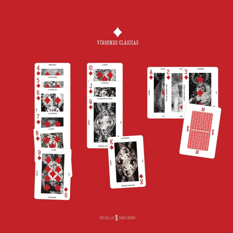 Baraja de cartas marianas con imágenes de la SSS, diseño Javier Navarro de Pablos, Sevilla Dibujada, 2024