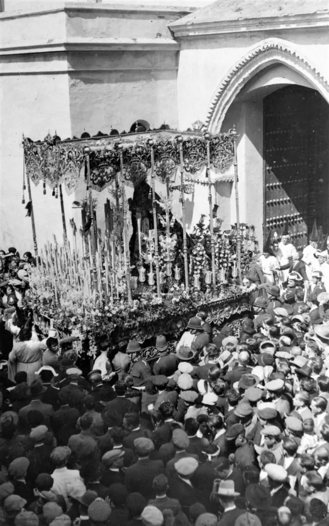 Entrada en la iglesia de San Gil de la Esperanza Macarena, Sevilla, años 1920. Las boinas sobre los sombreros nos aportan información social, Legado Turina, Fundación March